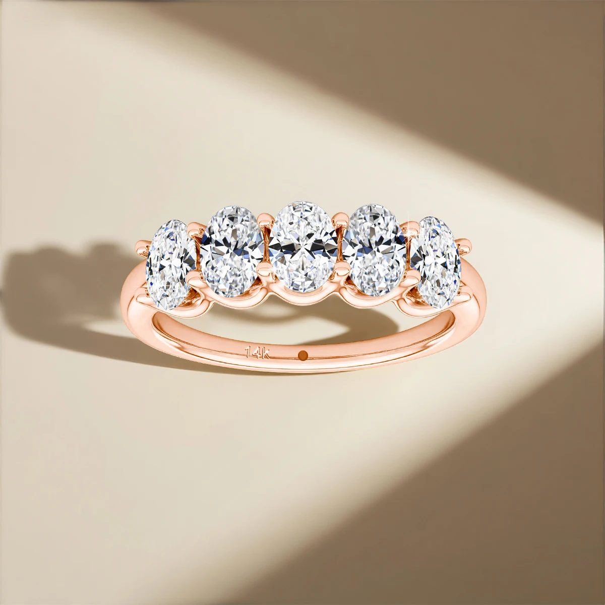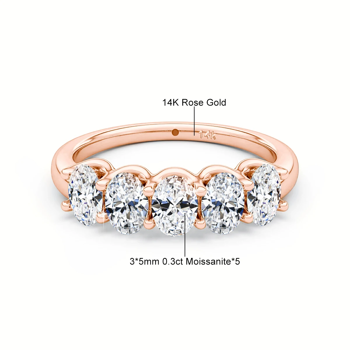 Each band showcases five oval‑cut moissanite stones (3×5mm, 0.3ct each), expertly secured in a classic prong setting to maximize fire and light reflection. The result is a radiant, luxurious shine that enhances any engagement, wedding, or anniversary look.